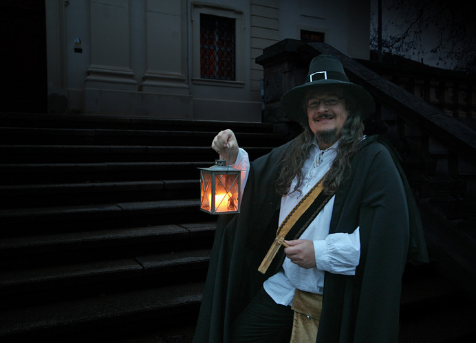 Mit dem "Mann mit der Laterne" lässt sich die Stadt Gera bei einem nächtlichen Rundgang unterhaltsam erkunden.